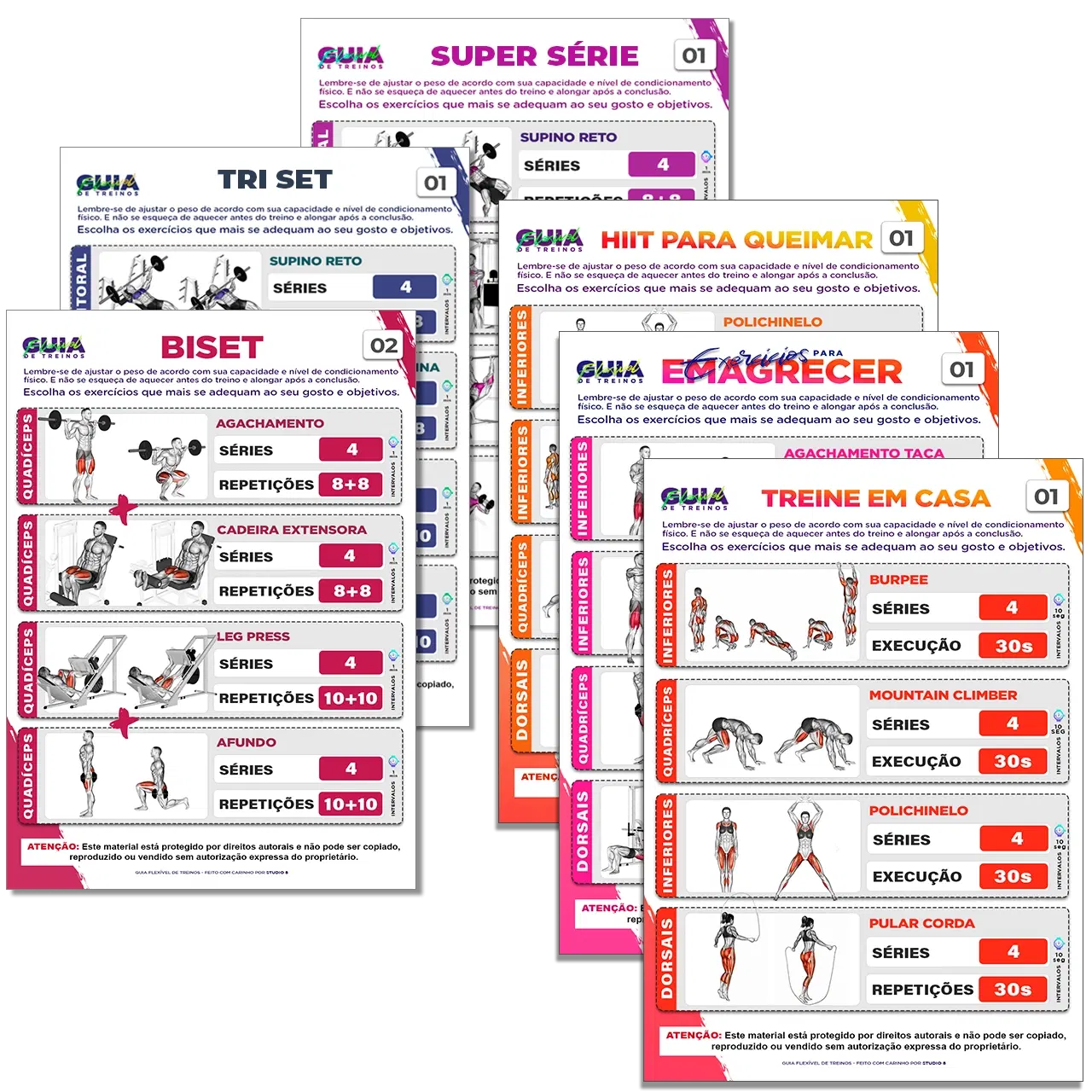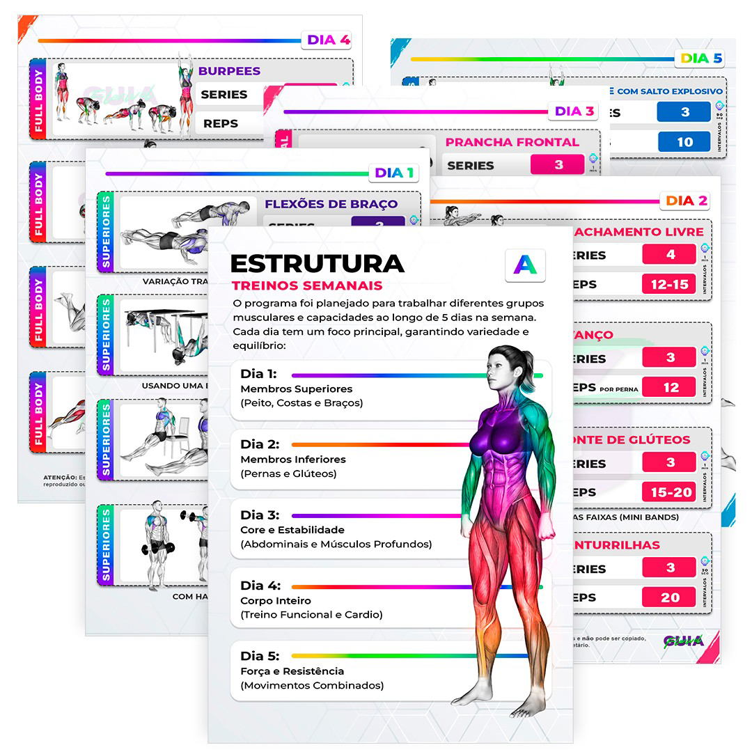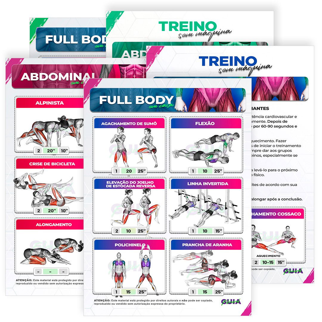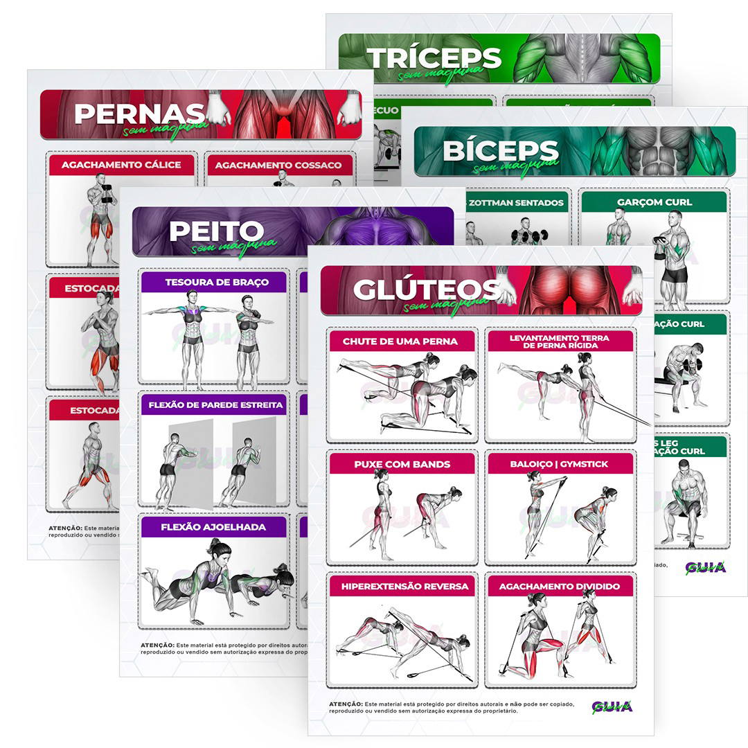 Treinos Prontos e Exercícios Ilustrados organizados por circuito, membros e objetivo.